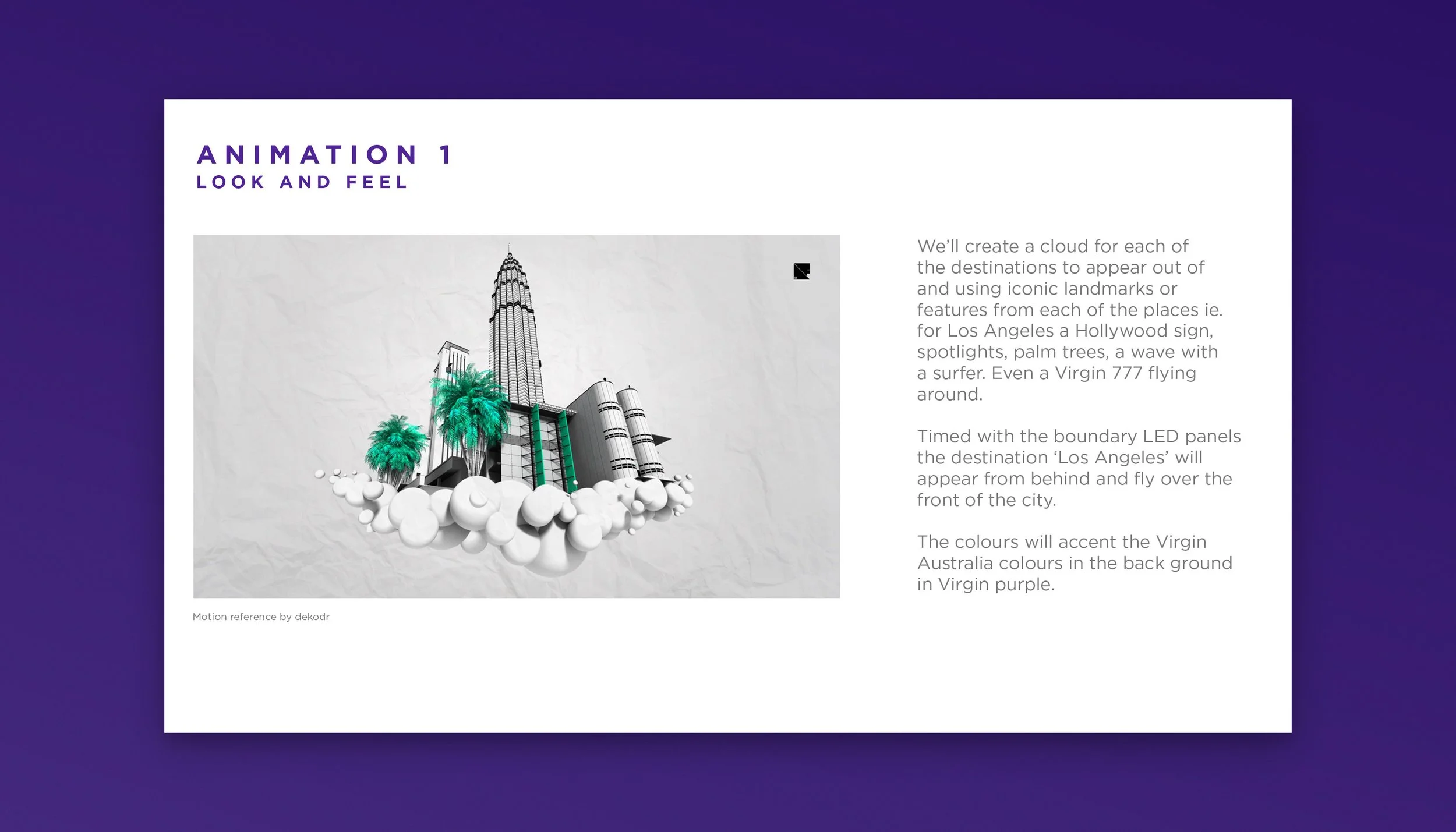 When Virgin Australia came to us with an idea of a promotion at Optus Stadium for a game half time, there were a number of great ideas but the one that stuck out was a some sort of kick competition. I was tasked with helping pull the Kick To Fly idea together along with the CD. I looked for visual references to help art-direct the promotion at the stadium on the big screen, LED boundary panels and also create an identity. The main visual was the big screen positioned right behind the goal posts contestants would kick toward. I found a great city-scene morph reference for the animators to take and create the destinations.